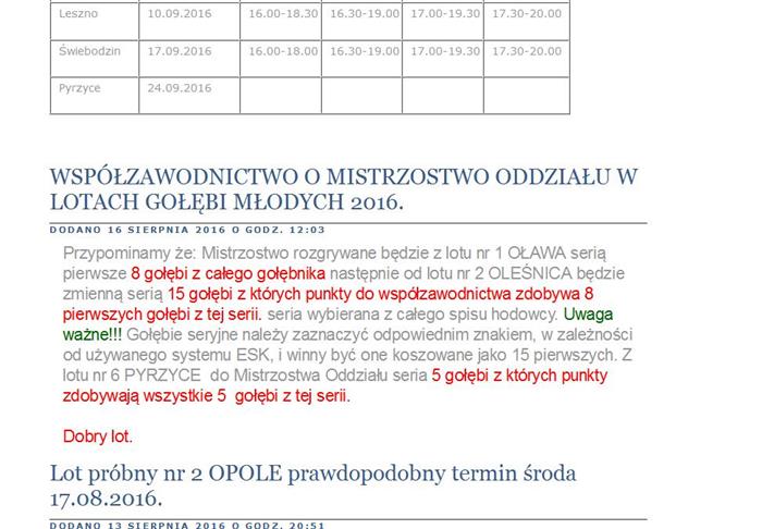 Lot z miejscowości OŁAWA odbyć w dniu 20.08.016 (sobota). Wkładanie gołębi nastąpi w dniu 19.08.2016 (piątek) godziny wkładań gołębi na punktach zgodnie z planem odjazdu dostarczonym hodowcom.